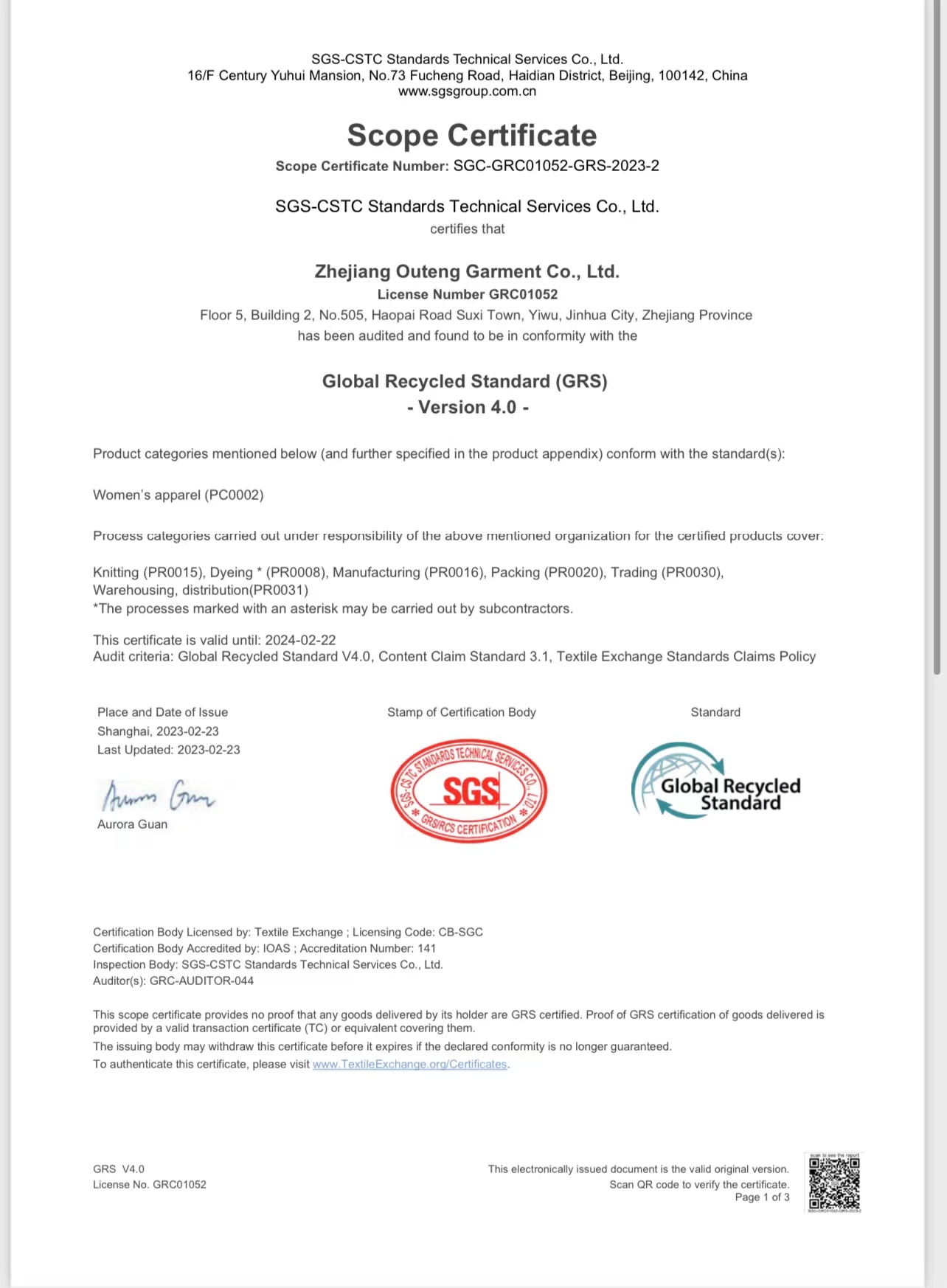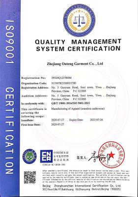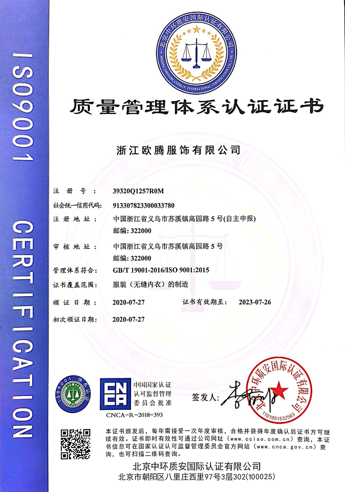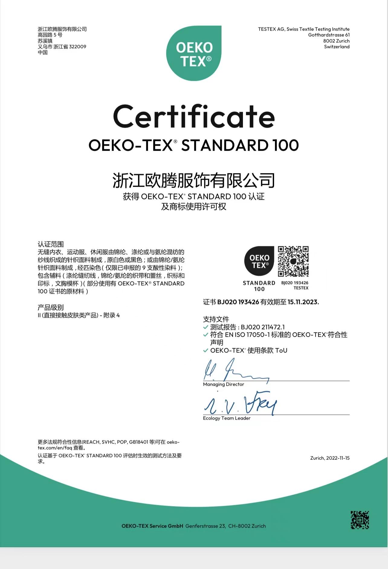 浙江歐騰服飾有限公司位于世界小商品之都-義烏。創(chuàng)立于2015年,是一家專業(yè)生產(chǎn)無(wú)縫針織運(yùn)動(dòng)服飾和內(nèi)衣的工貿(mào)一體企業(yè),擁有自主出口權(quán)。 工廠的占地面積約16000平方米 ,引進(jìn)了大型圣東尼、高騰等多種先進(jìn)的制衣設(shè)備300余臺(tái)。月產(chǎn)能可達(dá)90萬(wàn)件。 歐騰服飾每年投入近百萬(wàn)資金打樣開(kāi)發(fā)新產(chǎn)品,有著一支高素質(zhì)設(shè)計(jì)、技術(shù)員工隊(duì)伍。工廠先后通過(guò)了ISO 9001質(zhì)量管理體系認(rèn)證、BSCI認(rèn)證、GRS認(rèn)證、OEKO-TEX國(guó)際生態(tài)紡織品認(rèn)證等多項(xiàng)專利檢測(cè)報(bào)告。可提供OEM&ODM服務(wù)。歐騰服飾以一套完整、科學(xué)的質(zhì)量管理體系,生產(chǎn)的服裝從原材料紗線到成衣,質(zhì)量完全能夠滿足國(guó)內(nèi)、國(guó)際質(zhì)量要求。獲得了客戶一致好評(píng)。工廠先后獲得省科技型企業(yè)、國(guó)家高新企業(yè)、義烏市誠(chéng)信講信用單位、規(guī)上企業(yè)、信用AAA級(jí)等榮譽(yù)。
